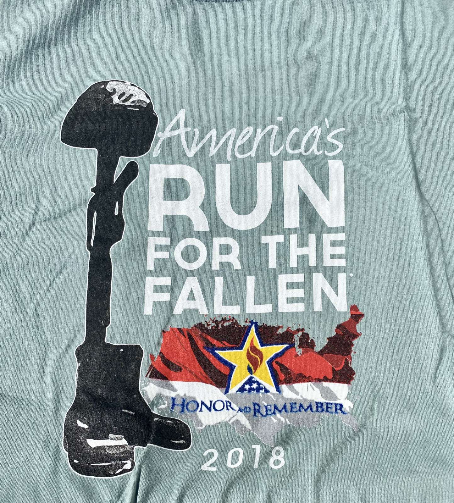 100% Cotton. Due to the discounted price and varied color options based upon sizes, you will not be able to select color. We will determine shirt color based on availability at shipping. These shirts are sold in support of the Run for the Fallen program. Front logo is in full color.