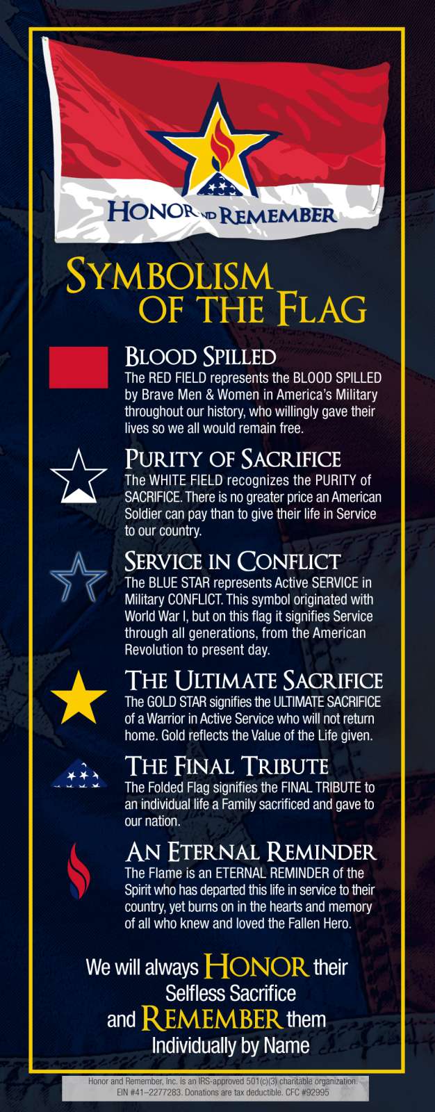 Two-sided infographic displaying Honor and Remember flag symbolism and mission (pamphlet size 3x8)